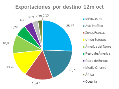 En los 12 meses finalizados en octubre el Mercosur fue el principal destino como bloque, representando el 25,47% del total de bienes exportados. Asia Pacífico fue el segundo con el 18,7% del total y las zonas francas alcanzaron 15,47% (la mayor parte se destina a China).