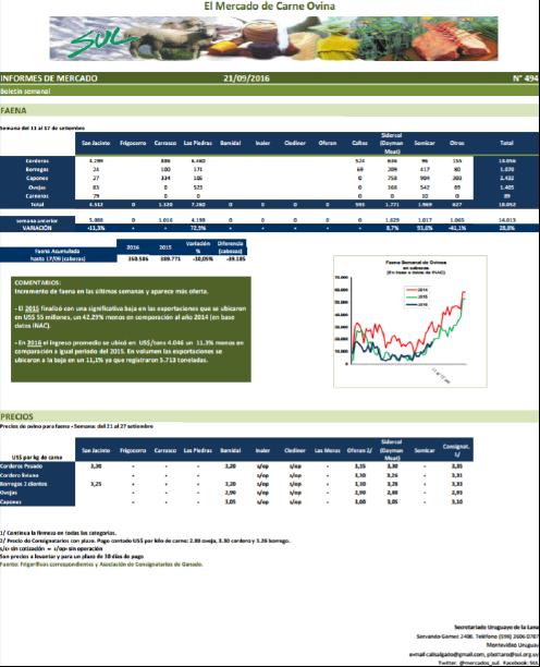En sus comentarios el SUL indica que existe un “incremento de faena en las últimas semanas y aparece más oferta”, al tiempo que recuerda que “el año 2015 finalizó con una significativa baja en las exportaciones que se ubicaron en US$ 55 millones, un 42.29% menos en comparación al año 2014 (en base datos INAC)”.