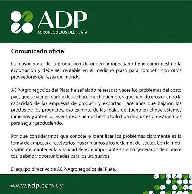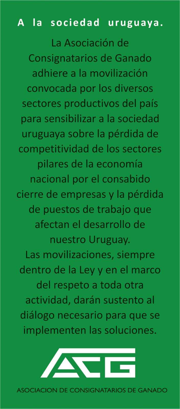 La Asociación Uruguaya de Comunicadores Agropecuarios, AUCA, ante la situación actual del sector productivo, industrial comercial y de los trabajadores, de nuestro país, manifiesta su preocupación por el presente y futuro de esta situación que nos compromete a todos.