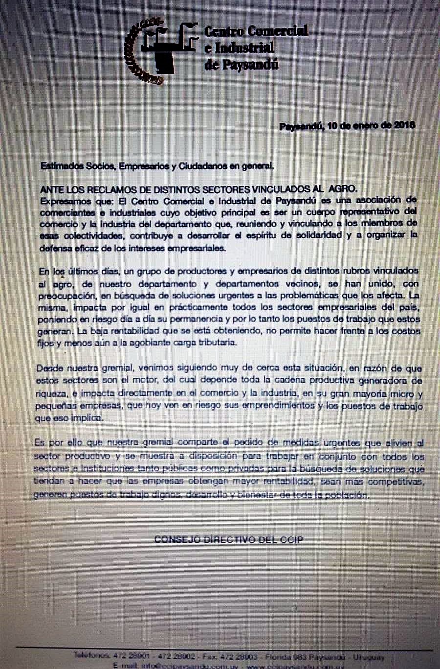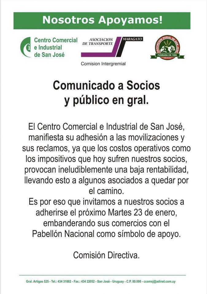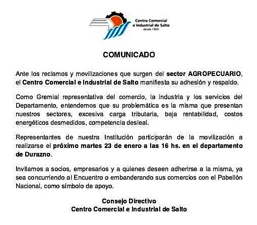 Al apoyo brindado a ésta movilización por parte de las instituciones y gremiales vinculadas al campo, se le sumó el respaldo de la Cámara de Industrias del Uruguay (CIU) y de la Cámara Regional de Empresarios y Comerciantes del Este.