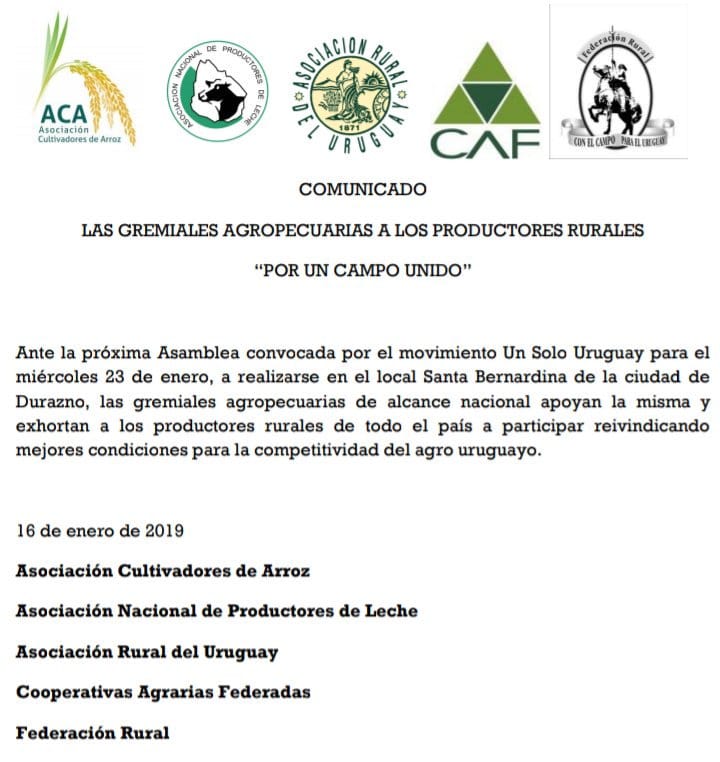Con la consigna “Por un campo unido” productores de todo el país participarán en la asamblea convocada por el Movimiento Un Solo Uruguay, que se desarrollará el próximo 23 de enero en Santa Bernardina, (Durazno).