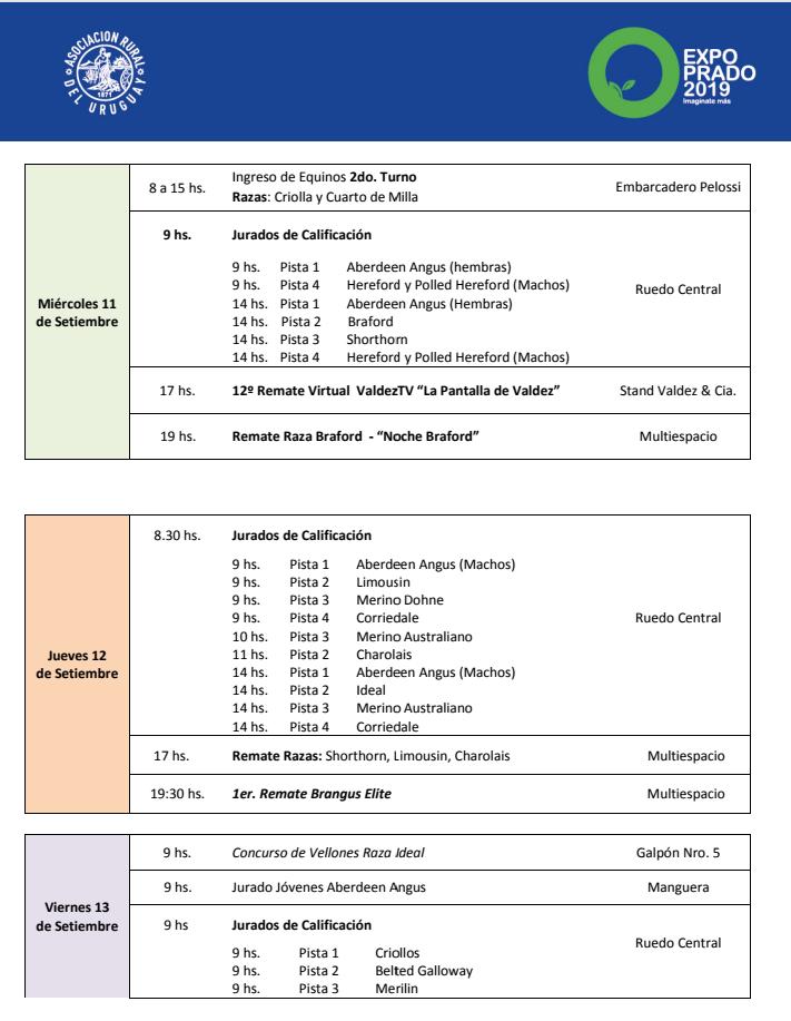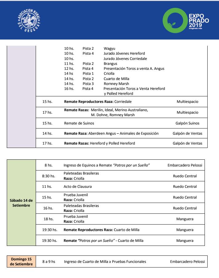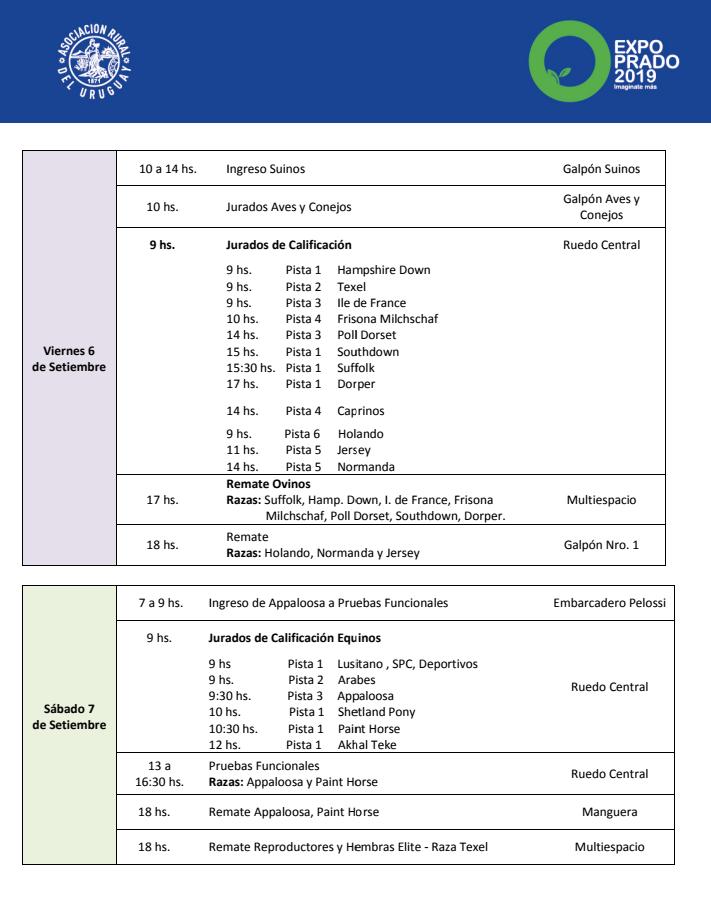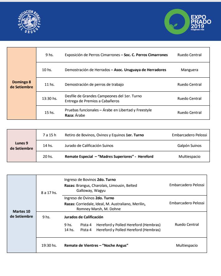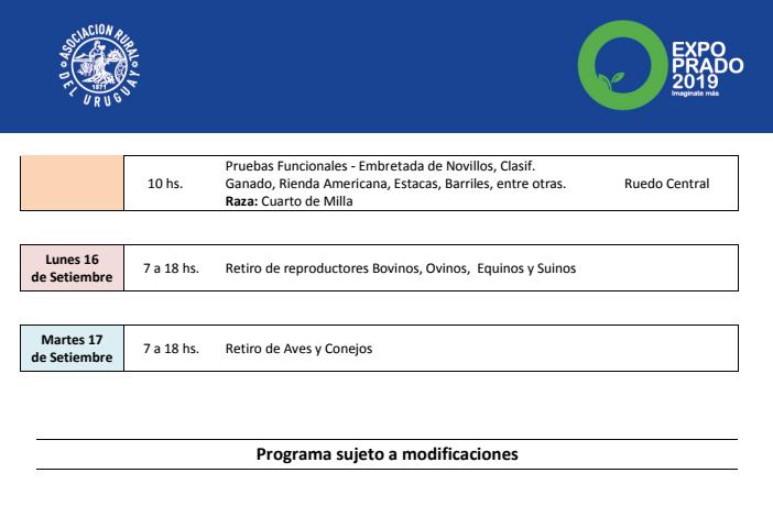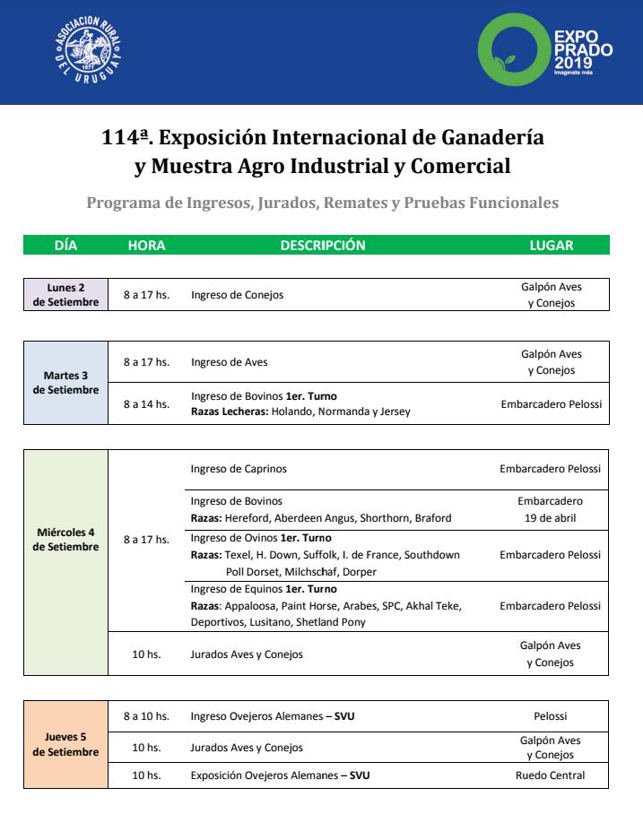 En esta 114ª edición de la Expo Prado, la ARU ha establecido un nuevo formato de programa, que va en la línea de ofrecer mejores condiciones de participación a los expositores y sus animales. El principal cambio es de establecer para cada especie dos turnos de participación de 6 días cada uno, acortando los tiempos de permanencia en el predio de los animales, lo cual redunda en un aumento de la capacidad locativa del predio, y en una mejora de las condiciones de estadía para estos.